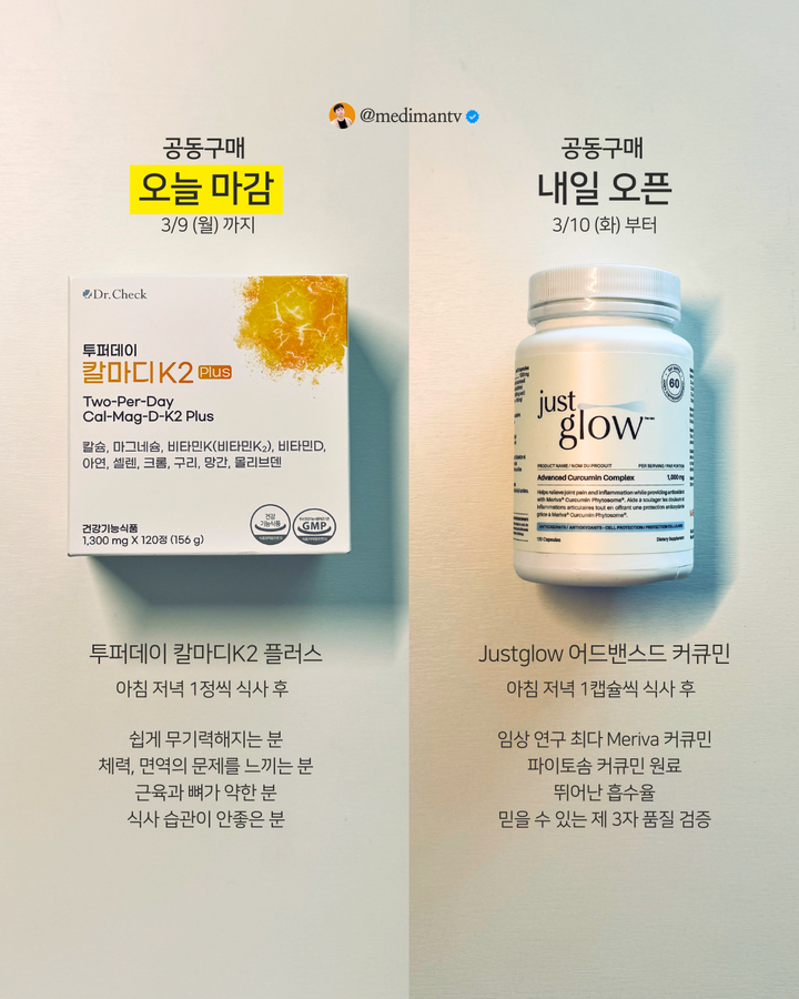 칼마디 K2 외 1건 공구medimantv팔로워 9.1만|24일 전공구 정보 (2건)칼마디 K2종료식품 > 건강식품|3/9 (월) 오픈Justglow 어드밴스드 커큐민종료식품 > 건강식품|3/10 (화) 오픈AI가 정리한 정보예요. 실수가 있을 수 있어요원본 게시물인스타그램에서 보기#칼마디#멀티비타민#건강보조식품#면역기능개선#컨디션관리#커큐민#영양제#Meriva#위장부담출처 @medimantv구매하러 가기
