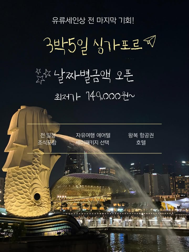 싱가포르 자유여행 에어텔 공구lj_latelier팔로워 8.6만|약 1개월 전싱가포르 자유여행 에어텔종료여행 > 패키지/투어|3/20 (금) 오픈AI가 정리한 정보예요. 실수가 있을 수 있어요원본 게시물인스타그램에서 보기#싱가포르#에어텔#여행#여행패키지#하나투어출처 @lj_latelier구매하러 가기