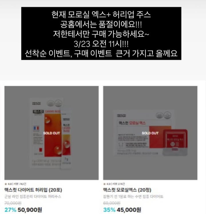 맥스컷 모로실 엑스+허리업 주스 공구_myssong_팔로워 5.2만|29일 전맥스컷 모로실 엑스+허리업 주스종료식품 > 건강식품|3/23 (월) 오픈AI가 정리한 정보예요. 실수가 있을 수 있어요원본 게시물인스타그램에서 보기#맥스컷#모로실#다이어트#허리업#주스출처 @_myssong_구매하러 가기