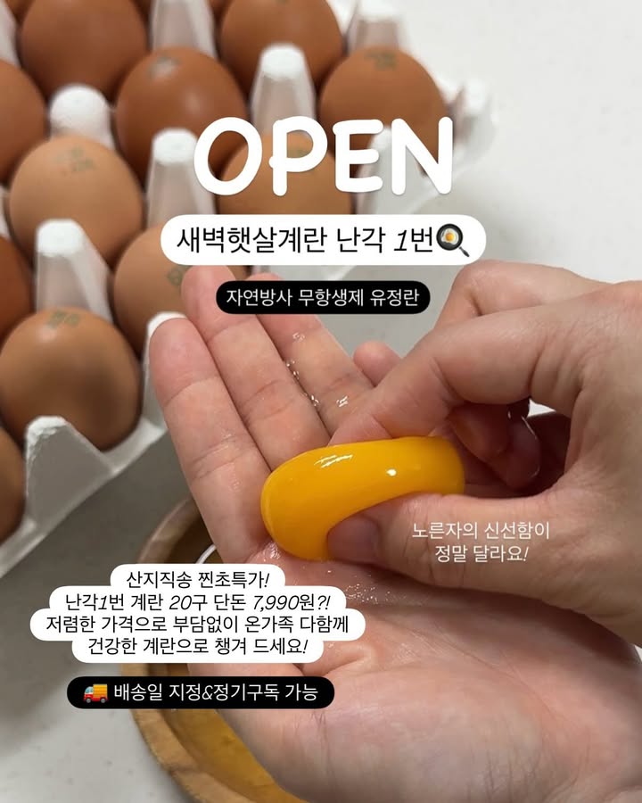 새벽햇살계란 공구ddohuni_mom팔로워 12.9만|27일 전새벽햇살계란종료식품 > 신선식품|3/24 (화) ~ 3/29 (일)AI가 정리한 정보예요. 실수가 있을 수 있어요원본 게시물인스타그램에서 보기#새벽햇살계란#계란#난각1번#친환경#자연방목출처 @ddohuni_mom구매하러 가기