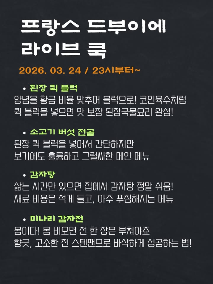 드부이 어피니티 하나 공구jiemma_official팔로워 35.9만|27일 전드부이 어피니티 하나종료홈리빙 > 주방용품|3/24 (화) 오픈AI가 정리한 정보예요. 실수가 있을 수 있어요원본 게시물인스타그램에서 보기#드부이#어피니티#요리#라이브쿡#된장퀵블럭출처 @jiemma_official구매하러 가기