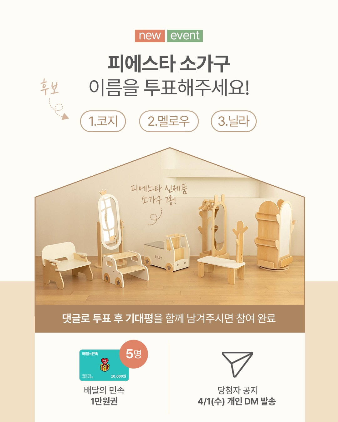 피에스타 소가구 공구toymiso_kr팔로워 2.8만|25일 전피에스타 소가구종료홈리빙 > 생활용품|3/25 (수) ~ 4/1 (수)AI가 정리한 정보예요. 실수가 있을 수 있어요원본 게시물인스타그램에서 보기#피에스타#소가구#투표이벤트#배달의민족#이벤트출처 @toymiso_kr구매하러 가기