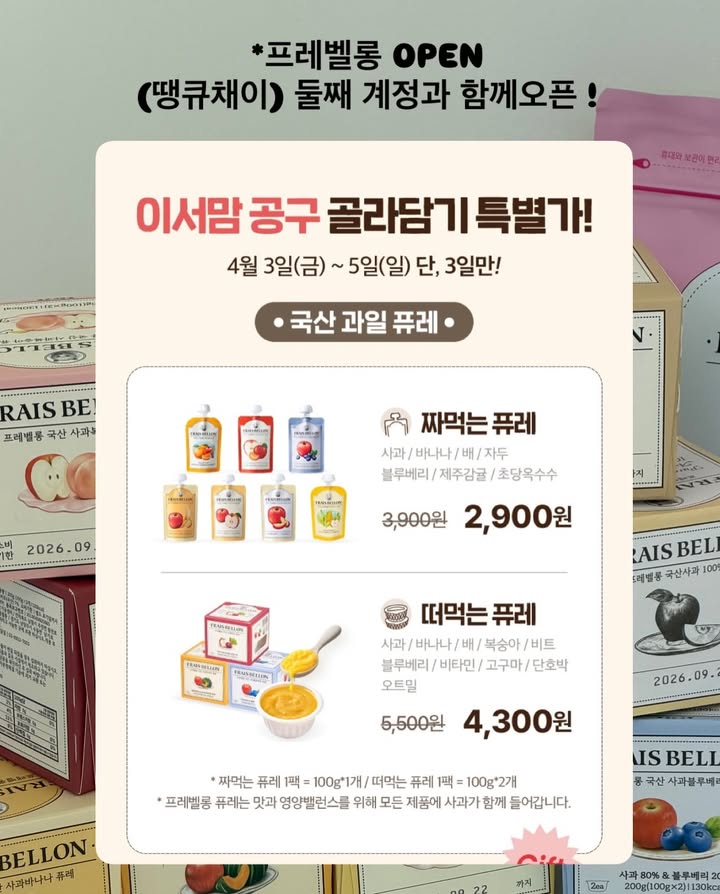 프레벨롱 퓨레 공구babjomjuiseo팔로워 12.4만|17일 전프레벨롱 퓨레종료4/3 (금) ~ 4/5 (일)AI가 정리한 정보예요. 실수가 있을 수 있어요원본 게시물인스타그램에서 보기#퓨레#아이간식#프레벨롱#자연식품출처 @babjomjuiseo구매하러 가기