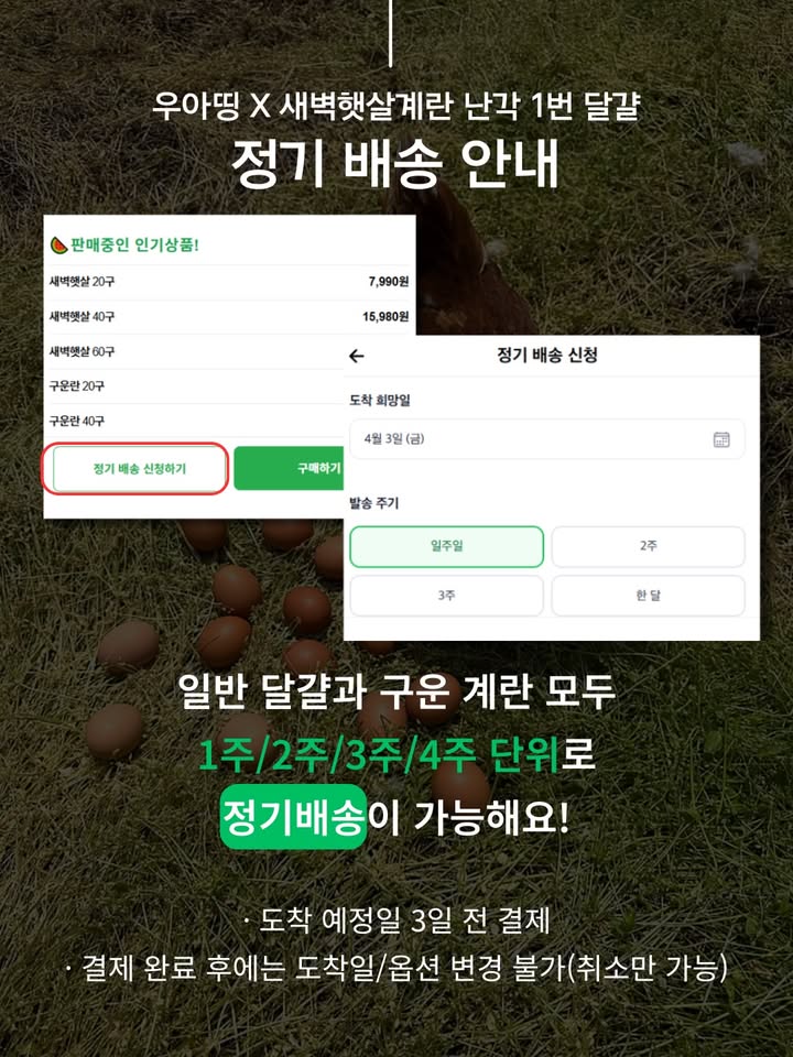 1등급 난각번호1번 계란 공구wooahthink_팔로워 11.2만|2일 전1등급 난각번호1번 계란2일 전 오픈식품 > 유제품|4/2 (목) ~ 4/5 (일)AI가 정리한 정보예요. 실수가 있을 수 있어요원본 게시물인스타그램에서 보기#계란#정기배송#난각번호1번#신선한달걀#공동구매출처 @wooahthink_구매하러 가기