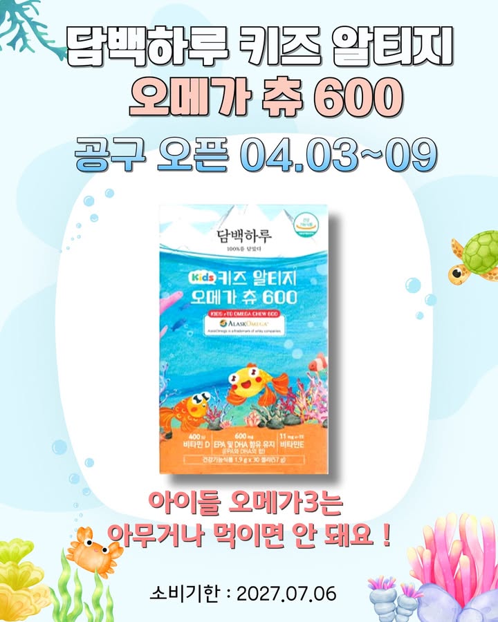 담백하루 키즈 오메가3 공구strawberry_yaksa팔로워 8.6만|약 21시간 전담백하루 키즈 오메가3어제 오픈식품 > 건강식품|4/3 (금) 오픈AI가 정리한 정보예요. 실수가 있을 수 있어요원본 게시물인스타그램에서 보기#키즈오메가3#오메가3#건강식품출처 @strawberry_yaksa구매하러 가기