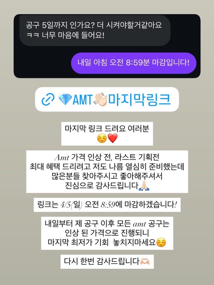 Amt 가격 인상 기획전 공구nari_table_팔로워 11.2만|15일 전Amt 가격 인상 기획전종료홈리빙 > 생활용품|4/5 (일) 오픈AI가 정리한 정보예요. 실수가 있을 수 있어요원본 게시물인스타그램에서 보기#Amt#공동구매#기획전출처 @nari_table_구매하러 가기