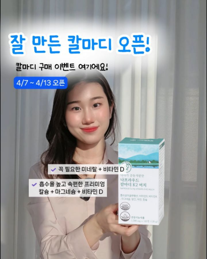 나프라우드 칼마디 공구byak_yaksa팔로워 10.3만|1일 전나프라우드 칼마디2일 전 오픈식품 > 건강식품|4/7 (화) ~ 4/14 (화)AI가 정리한 정보예요. 실수가 있을 수 있어요원본 게시물인스타그램에서 보기#미네랄#칼마디#여성건강#나프라우드칼마디#비타민D출처 @byak_yaksa구매하러 가기