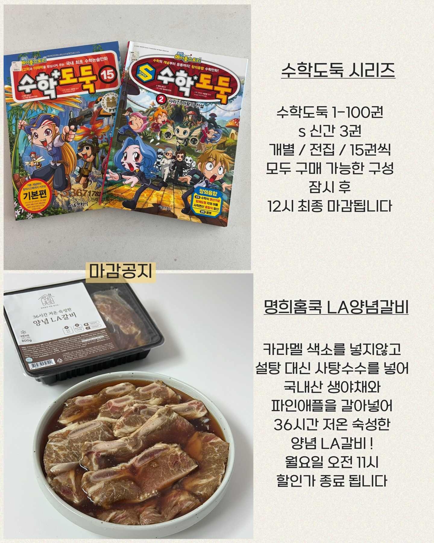 수학 도둑 시리즈 외 1건 공구myunghee_homecook팔로워 14.3만|약 8시간 전공구 정보 (2건)수학 도둑 시리즈어제 오픈키즈 > 교구 교육용품|4/12 (일) 오픈양념 LA갈비오늘 11시 오픈식품 > 간편식밀키트|4/13 (월) 오픈AI가 정리한 정보예요. 실수가 있을 수 있어요원본 게시물인스타그램에서 보기#교육#수학도둑#아이들책#식사#명희홈쿡#양념LA갈비출처 @myunghee_homecook구매하러 가기