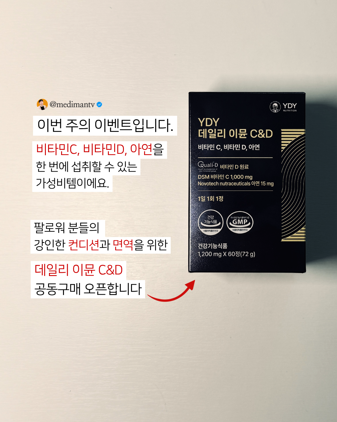 데일리 이뮨 비타민 C&D 공구medimantv팔로워 9.1만|약 8시간 전데일리 이뮨 비타민 C&D오늘 오픈식품 > 건강식품|4/21 (화) 오픈AI가 정리한 정보예요. 실수가 있을 수 있어요원본 게시물인스타그램에서 보기#비타민C#비타민D#아연#면역#영양제출처 @medimantv구매하러 가기