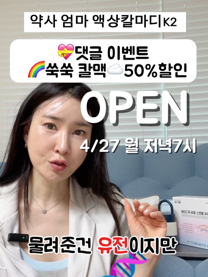 쑥쑥 칼맥 공구yaksamom팔로워 12.7만|약 6시간 전쑥쑥 칼맥4일 후 오픈 예정식품 > 건강식품|4/27 (월) 오픈AI가 정리한 정보예요. 실수가 있을 수 있어요원본 게시물인스타그램에서 보기#키성장#영양제#쑥쑥칼맥#할인#이벤트출처 @yaksamom구매하러 가기