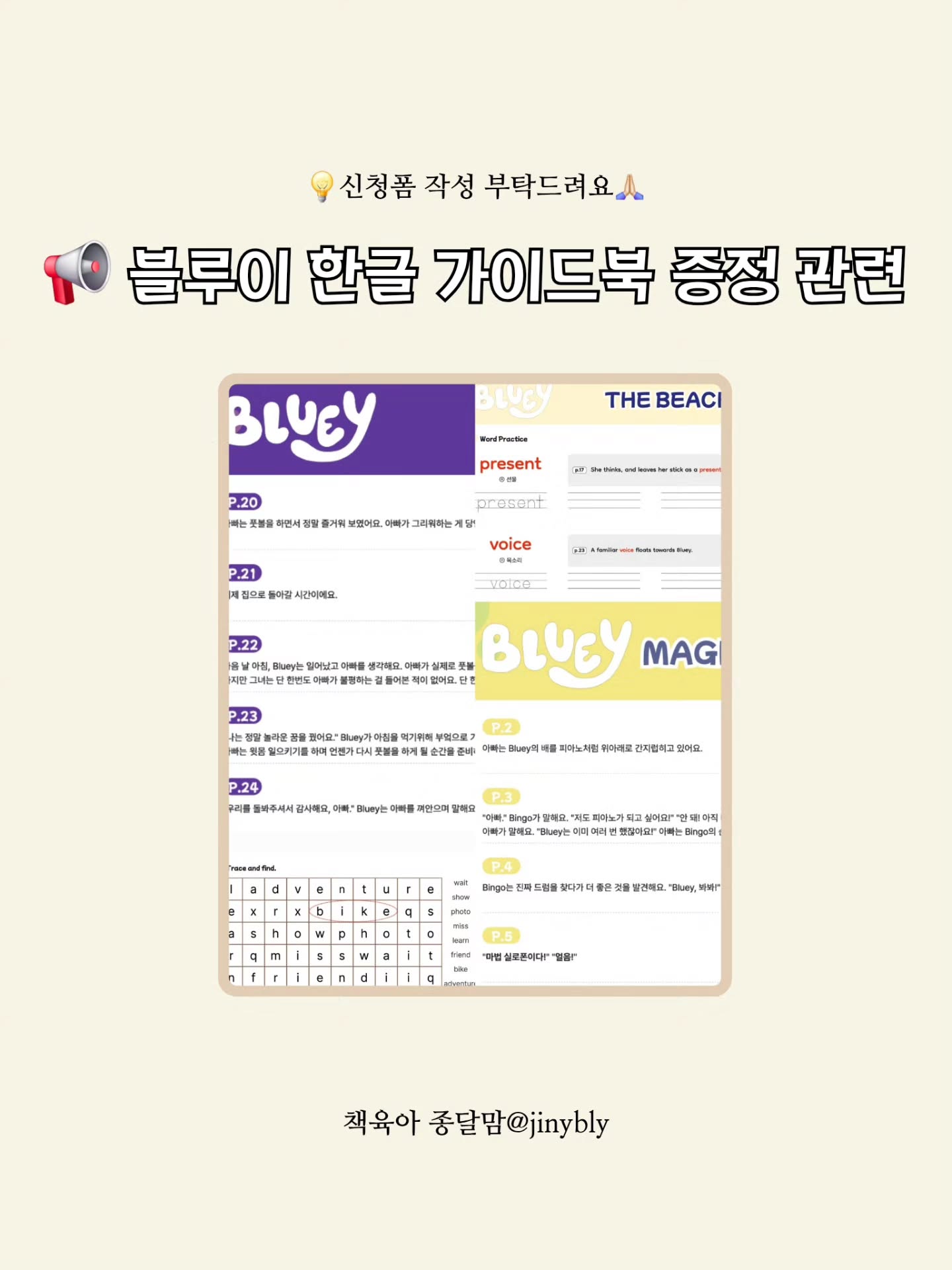 블루이 한글 해석 공구jinybly팔로워 3.7만|약 7시간 전블루이 한글 해석오늘 오픈키즈 > 교구/교육|4/28 (화) 오픈AI가 정리한 정보예요. 실수가 있을 수 있어요원본 게시물인스타그램에서 보기#블루이#영어그림책#한글해석#책육아#원서그림책출처 @jinybly구매하러 가기
